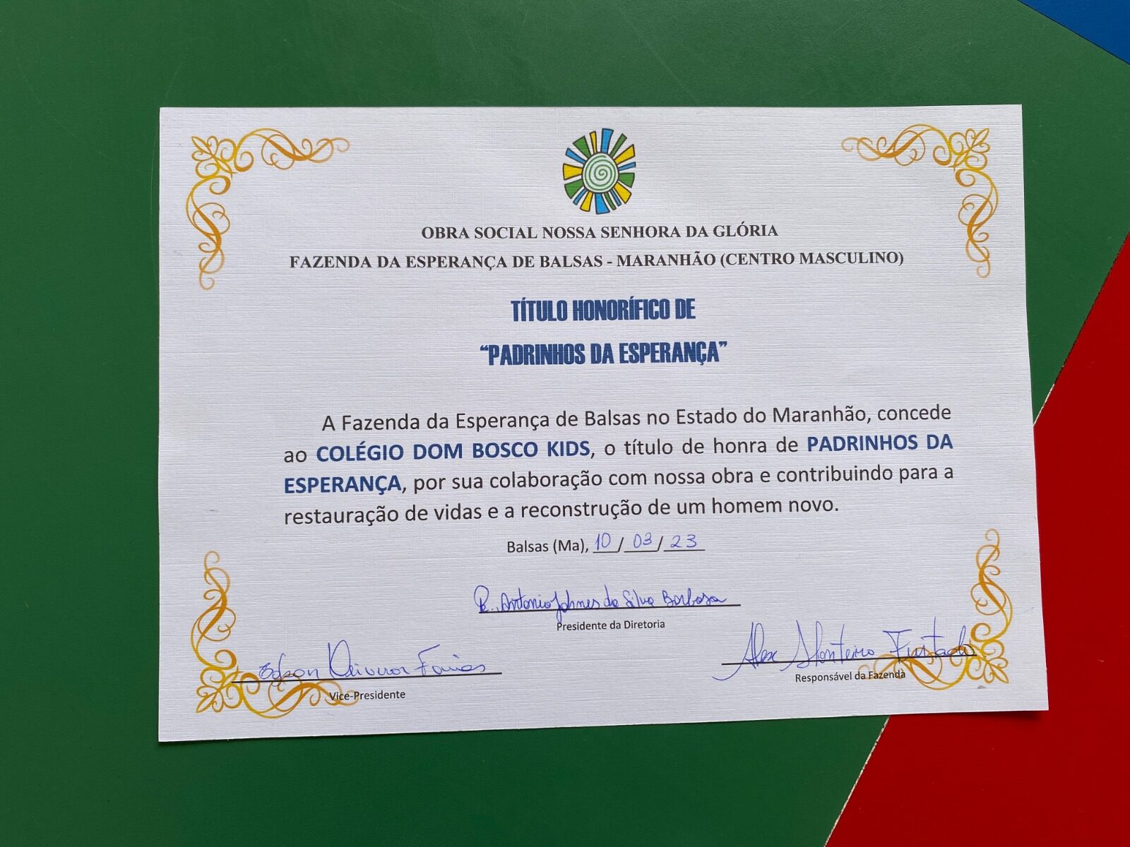 A Fazenda da Esperança de Balsas no Estado do Maranhão, concede ao COLÉGIO DOM BOSCO KIDS, o título de honra de PADRINHOS DA ESPERANÇA, por sua colaboração com nossa obra e contribuindo para a restauração de vidas e a reconstrução …